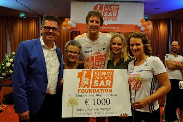 Bij het eerste lustrum hebben we een uitvaartbeurs georganiseerd bij Het Wapen van Ens, wat zeer goed bezocht werd en als heel waardevol werd ervaren. Nu bij ons 10-jarig bestaan wilden we graag een donatie doen aan een goed doel. Van dichtbij hebben wij twee jaar geleden meegemaakt, dat een jong iemand een hersenbloeding kreeg en gelukkig mocht herstellen. 16 november jl hebben we daarom een donatie overhandigd aan Edwin en Annemarie van der Sar.
