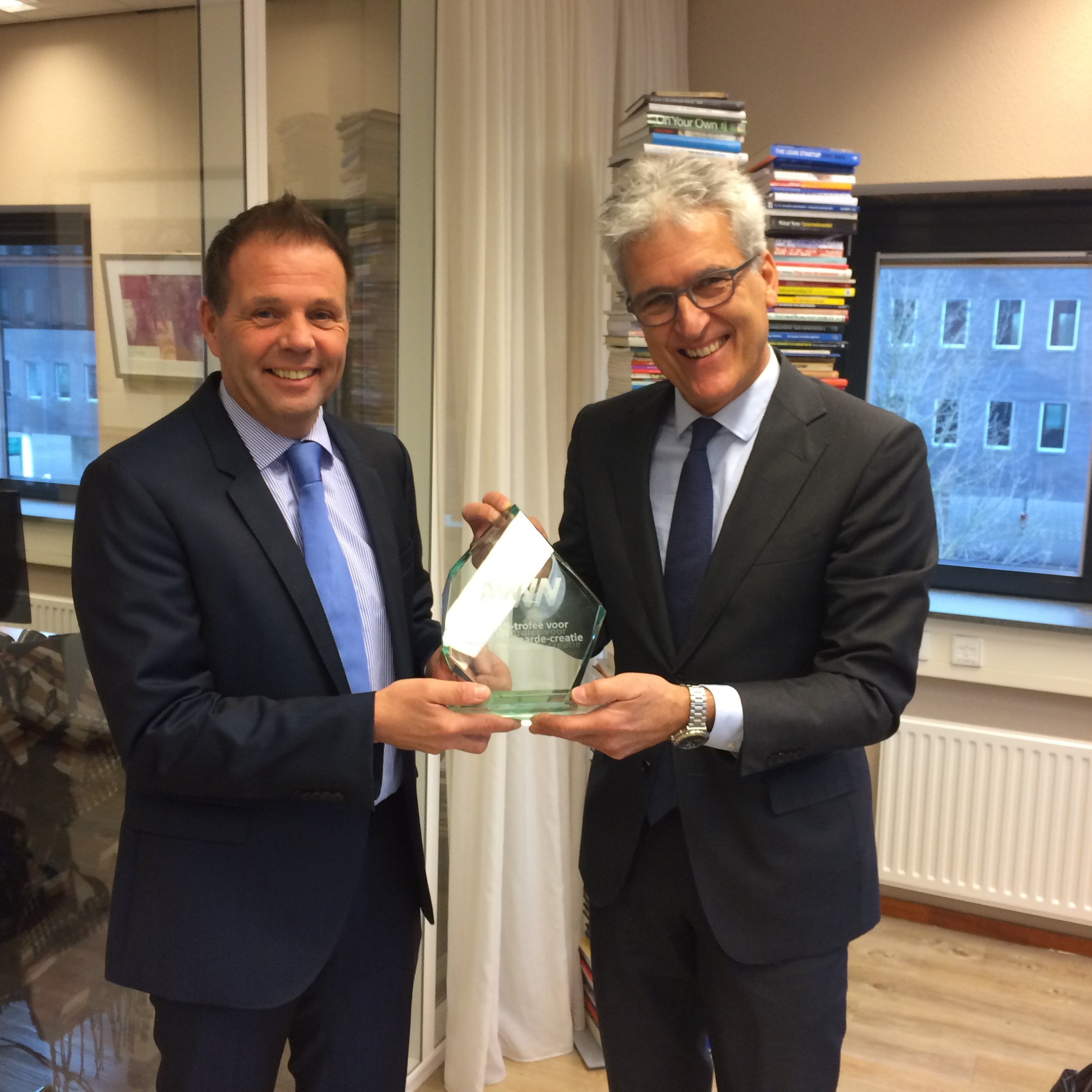 Op de foto ontvangt Ron Bavelaar, directievoorzitter van Yarden (links), de AWVN-trofee uit handen van Erik Groot, directeur programma’s en externe relaties bij AWVN.