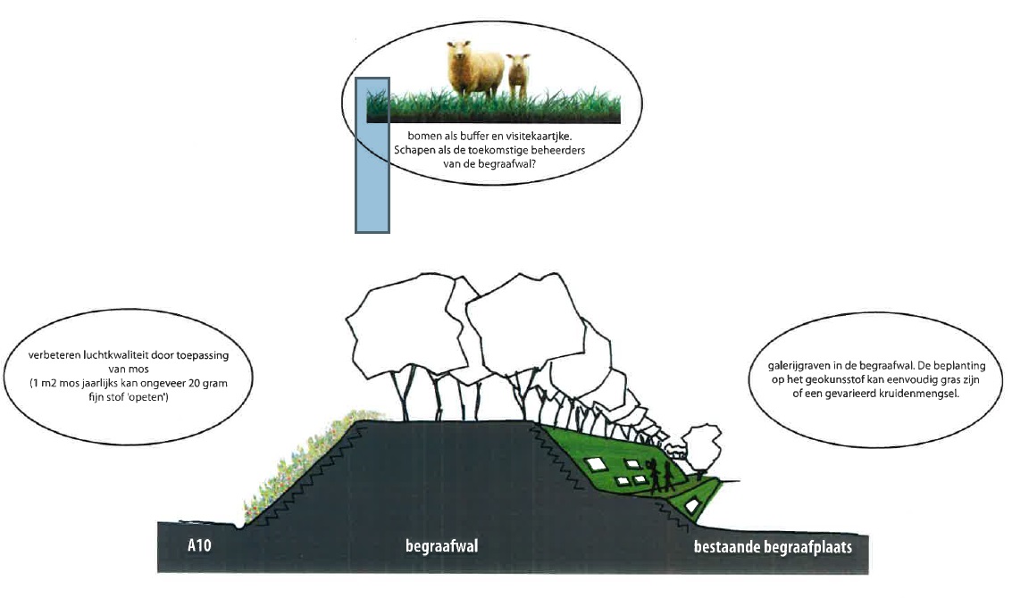 Nadat vanuit de Zuidas de vraag aan de begraafplaats werd gesteld om na te denken over een invulling van het gebied, kwam het door Vink ingeschakelde architectenbureau op de proppen met het huidige conceptplan, vertelt ze: “Er moest sowieso een afscheiding komen om geluid van de A10 tegen te houden. Op deze manier hebben wij hier zelf een mooie invulling aan kunnen geven. Voor consumenten wordt het toch wat exclusiefs om in zo’n wal begraven te kunnen worden, terwijl we tegelijkertijd een mooie groene rand voor de begraafplaats en voor de Zuidas kunnen realiseren.”