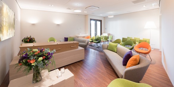 Crematorium en uitvaartcentrum Domstede ligt op De Wetering, direct naast afrit 7 van de A2. ‘Het is een eigentijds en bijzonder gebouw met organische vormen. De grote glaswanden zorgen voor veel lichtinval en een direct contact met de parkachtige omgeving’, zegt locatiemanager Daniël Dijkgat. ‘Binnen helpt het kleurrijke en huiselijke interieur nabestaanden bij het creëren en vasthouden van mooie herinneringen tijdens een verdrietig moment.’