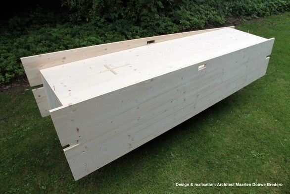De kist van Bredero is aanpasbaar aan ieders lichaamsgrootte en bestaat uit de natuurlijke materialen vurenhout, ongebleekt katoen en zaagsel als bed.