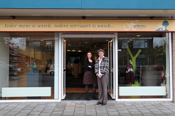 Onlangs betrok Harmsma Uitvaartverzorging een kantoor aan de Burgemeester de Bruïnelaan in Zwijndrecht. Vanaf de oprichting in 2004 runde Hetje Harmsma haar eenmansbedrijf vanuit huis. Sinds de verhuizing werkt ook uitvaartbegeleidster Brenda van Duren voor Harmsma Uitvaartverzorging. De uitvaartonderneemster werkt samen met een vrouwelijke fotograaf en bloemist en een dragersgilde dat uit vrouwen bestaat. Want: “Ieder mens wordt negen maanden gedragen door een vrouw, dan mag zij ook het laatste stukje doen.”