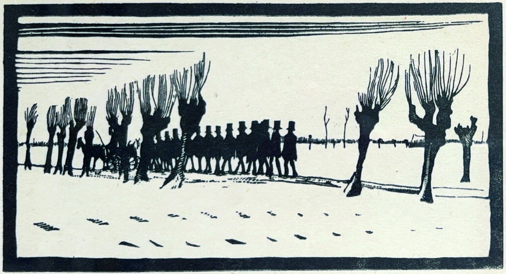 De kist met het koude lijk ligt op een kar. De zwartgeklede mannen zijn verbonden met elkaar en met de zwarte knotwilgen; kou en verdriet tot diep in de botten. Knotwilgen symboliseren melancholie, maar ook veerkracht. Je kan ze knotten, maar ze groeien snel weer terug. Zo biedt dit droefgeestige wintertafereel toch een beetje hoop.