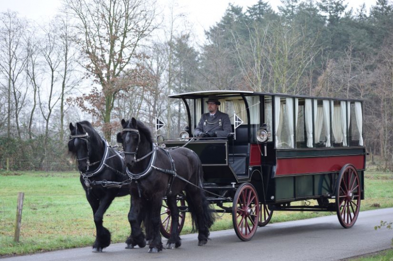 Met gepaste trots lanceert Stalhouderij Wijnand Hazeleger uit Voorthuizen dit jaar de speciale rouwomnibus. Een stijlvolle bordeauxrode/zwarte bus, getrokken door twee statige Friesche paarden. Deze unieke rouwomnibus rijdt door heel Nederland en is nergens anders te huur in Nederland.