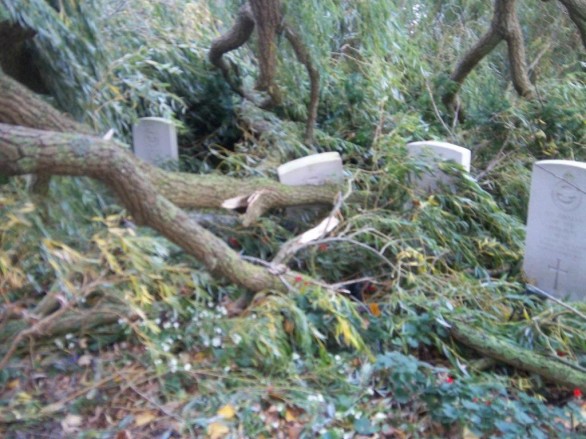 Ook op begraafplaatsen in Nederland is door de storm veel schade aangericht. Deze is veroorzaakt door ontwortelde bomen en afgerukte takken die op de graven vielen. Op zeker drie plaatsen in Nederland is hierdoor schade ontstaan aan geallieerde oorlogsgraven. De eerste melding kwam van de consul in de gemeente De Marne in Groningen. In de plaats Ulrum was een boom omgewaaid en op een plot van zeven gemenebest oorlogsgraven gevallen waardoor twee stenen gebroken zijn. Medewerkers van de technische dienst van de Oorlogsgravenstichting die in de provincie Groningen aan het werk waren, zijn direct naar Ulrum gestuurd om te helpen het plot vrij te maken. In samenwerking met medewerkers van de gemeente De Marne werden de takken afgezaagd en afgevoerd. Hierna konden de OGS-medewerkers het plot weer in orde maken. In afwachting van de levering van twee nieuwe grafstenen door de Commonwealth War Graves Commission, de Engelse zusterorganisatie van de Stichting, werden de gebroken stenen provisorisch gerepareerd. Ook in Puiflijk, gemeente Druten, en op de gemeentelijke begraafplaats in Rhenen zijn problemen gemeld. Deze worden volgende week opgelost door medewerkers van de gemeenten en medewerkers van de Oorlogsgravenstichting. Op het ereveld Loenen op de Veluwe zijn twee bomen ontworteld en veel takken van bomen afgewaaid. Op het Militair ereveld Grebbeberg in Rhenen zijn alleen maar wat takken afgewaaid. Hierdoor is op de erevelden gelukkig geen schade ontstaan.