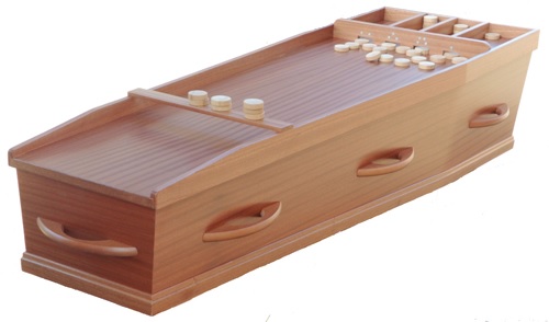 Op de eerste editie van de Uitvaartbeurs Amsterdam, zaterdag aanstaande in de Westerkerk, is er een noviteit: een sjoelbakkist! Een normale uitvaartkist waarvan het deksel omgebouwd is tot sjoelbak. De sjoelbakkist is een initiatief van www.uitvaart.nl, naar een idee van Wiljan Bakker.