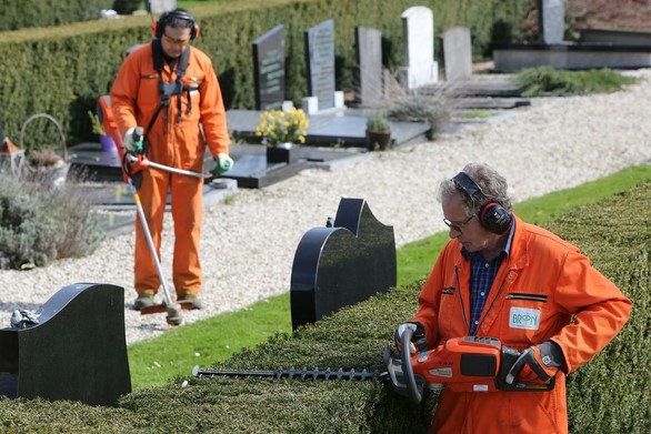 De introductie van het brede assortiment accugereedschappen van Husqvarna is een zegen voor de onderhoudsploeg van de gemeentelijke begraafplaats Papesteeg in Tiel. Bron Groenvoorziening uit Geldermalsen is verantwoordelijk voor het hovenierswerk. Hoofdbeheerder Ronald Aalbers: ‘Onderhoudswerk op een kerkhof ligt zeer gevoelig. Nabestaanden moeten in alle rust een graf kunnen bezoeken. Lawaai en benzinedampen zijn daarom uit den boze, maar het groen moet er wel permanent netjes uitzien. Daarom hebben wij bijna alle benzinegereedschappen vervangen door accumachines. Die werken stil, 100% schoon en trillingsarm. Met één extra accu kan ik de hele dag met de machines werken.’ Aalbers is vaak zes dagen per week aan het werk op de begraafplaats van ongeveer 2,5 hectare met zo’n 5.000 graven en 200 urnplaatsen.