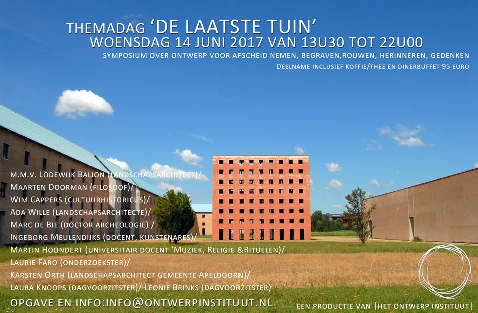 Tijdens het O’FEST, het Festival van het Tuinontwerp welk van 12 tot en met 17 juni 2017 in Apeldoorn plaatsvindt, zal elke dag in het kader van een ander thema staan. Op woensdag 14 juni is dat: De Laatste Tuin. Een poëtische titel voor een onderwerp dat de aandacht legt op begrippen als afscheid nemen, begraven, herinneren en rouwen. Fenomenen die meer en meer aandacht krijgen. De uiting van deze emoties is ook gekoppeld aan een plek of plaats en dient vorm gegeven te worden. Een opdracht die in het bijzonder weggelegd kan zijn voor de tuin- en landschapsontwerper van de kleine schaal.