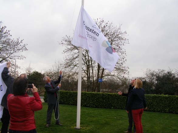 Directeur Hans Heikoop hees met de aanwezige managers en medewerkers de nieuwe vlag. Er is het afgelopen halfjaar samen met TOON reclame in Geldermalsen hard gewerkt aan de nieuwe huisstijl. Ralph Thijsen van TOON over het nieuwe logo: “We zijn op zoek gegaan naar een sterk en uniek beeldmerk, waarbij de kracht van de groep tot uiting komt en de verschillende dochterondernemingen ook individueel een sterk beeldmerk hebben. Transparantie, zachte kleuren en vormen maken het logo tot een herkenbaar geheel met een menselijk karakter.”